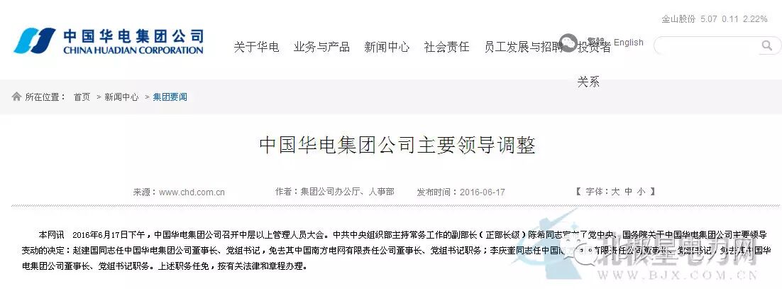 6月16日,南方电网公司官方宣布了主要领导调整情况。官方信息显示,在当天召开的南方电网公司中层以上管理人员大会上,中组部有关干部局负责同志宣布“李庆奎同志任中国南方电网有限责任公司董事长、党组书记,免去其中国华电集团公司董事长、党组书记职务;免去赵建国同志中国南方电网有限责任公司董事长、党组书记职务,另有任用。”