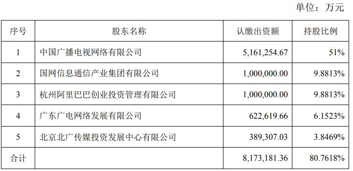 其他较小的股东:东方明珠、江苏有线、华数传媒等公司分别出资5亿元,持股0.4941%;贵广网络、吉视传媒、广西广电、广电网络、天威视讯、湖北广电等公司分别出资2亿元,持股0.1976%。