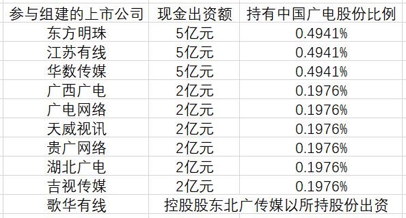 上述上市公司公告称,为了实现全国有线电视网络的统一运营管理、国有资产的保值增值,建设具有广电特色的5G网络并赋能有线电视网络,完成以全国互联互通平台为基础的有线电视网络IP化、智能化改造,促进有线电视网络转型升级,实现全国一网与5G的融合发展,中国广电有限联合其他46名发起人共同发起组建中国广电。